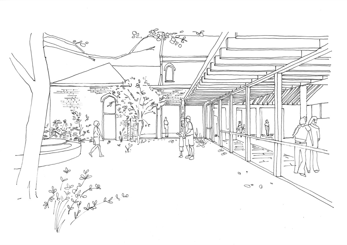 Een duidelijk leesbare structuur is hierbij cruciaal. Een nieuwe centrale as wordt daarom toegevoegd aan dit complex van verschillende gebouwen en buitenruimtes, waarbij de verschillende publieke ruimtes - het voorplein, de polyvalente zaal, de leestuin, de cafétaria en het buurtplein met petanquebanen - er rechtstreeks gelinkt aan worden gelinkt. Haaks op de centrale as leiden twee secundaire assen de bezoeker verder binnen in het Godshuis en het woonzorgcentrum.