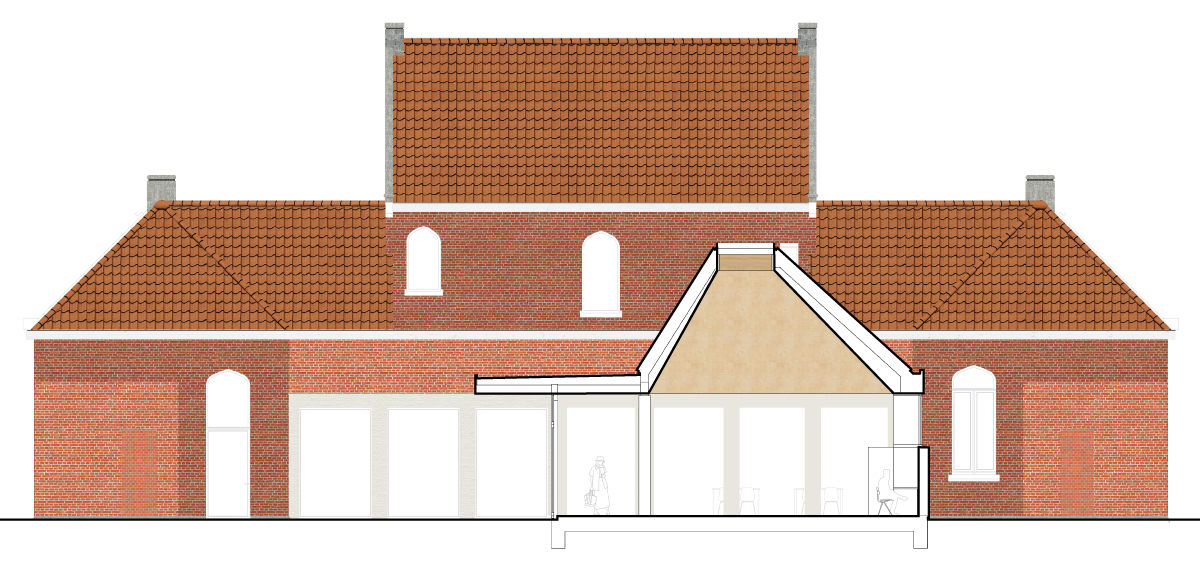 Een nieuwbouwvolume, met een expressieve dakvorm, vormt de verbinding tussen het godshuis en het woonzorgcentrum. Hier, in het hart van het project, wordt een polyvalente ruimte ingericht, gelinkt aan het centraal onthaal, gemeentelijke dienstverlening en het bibpunt in het godshuis, aan de cafetaria van het woonzorgcentrum, maar ook aan twee binnentuinen die zich nestelen in de oksels van de verschillende gebouwen.